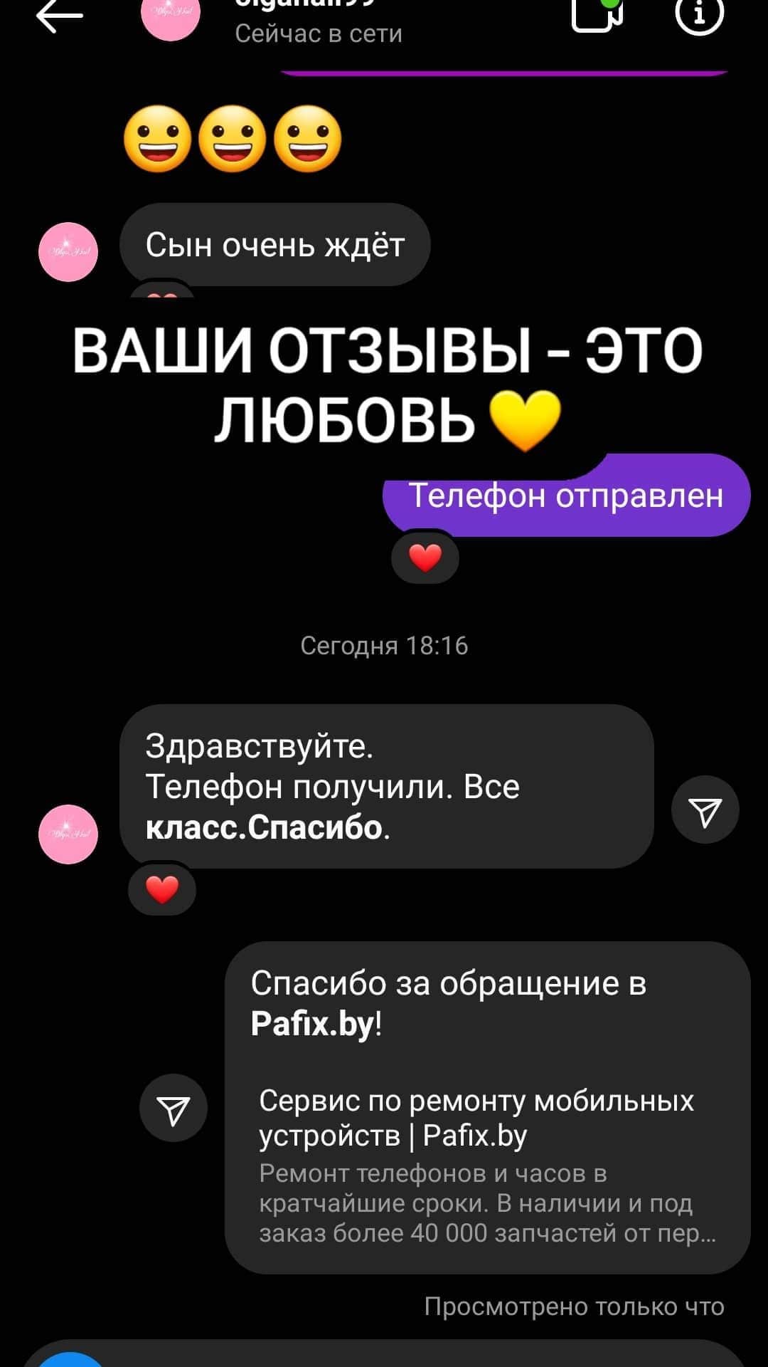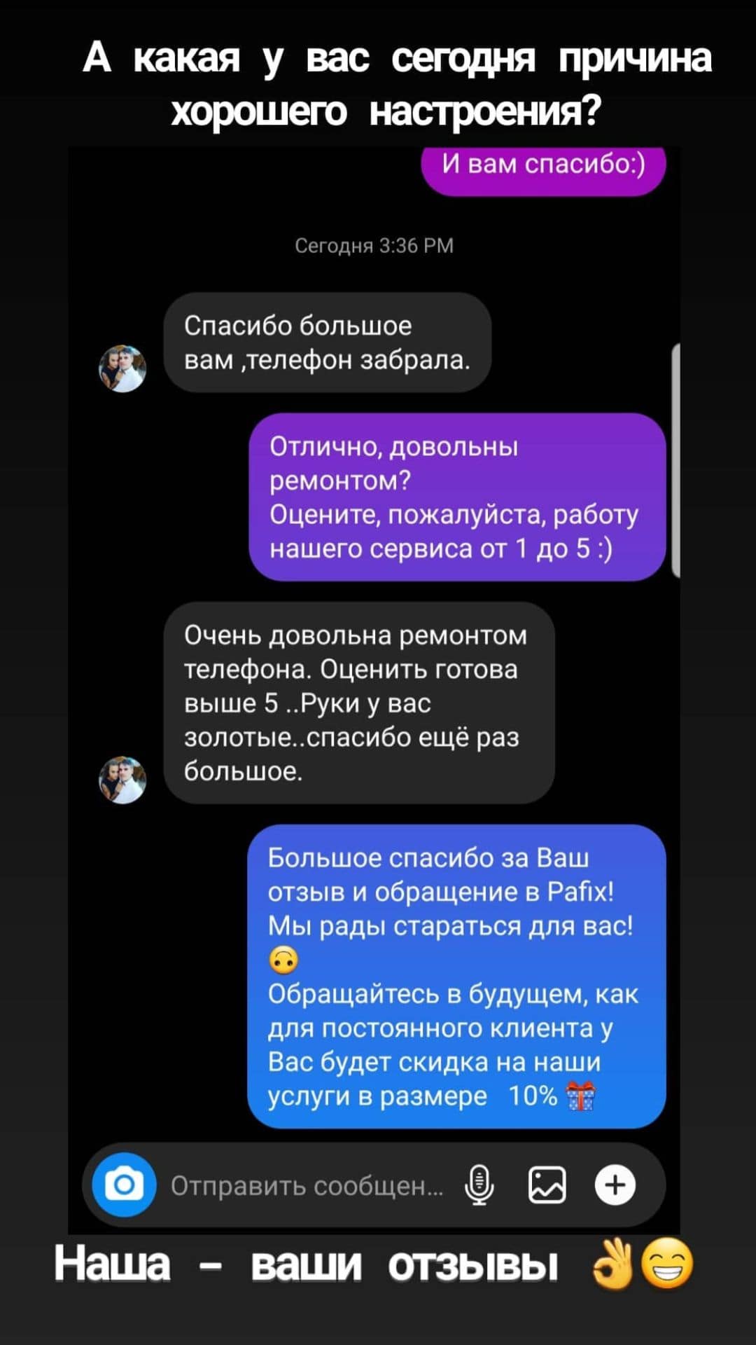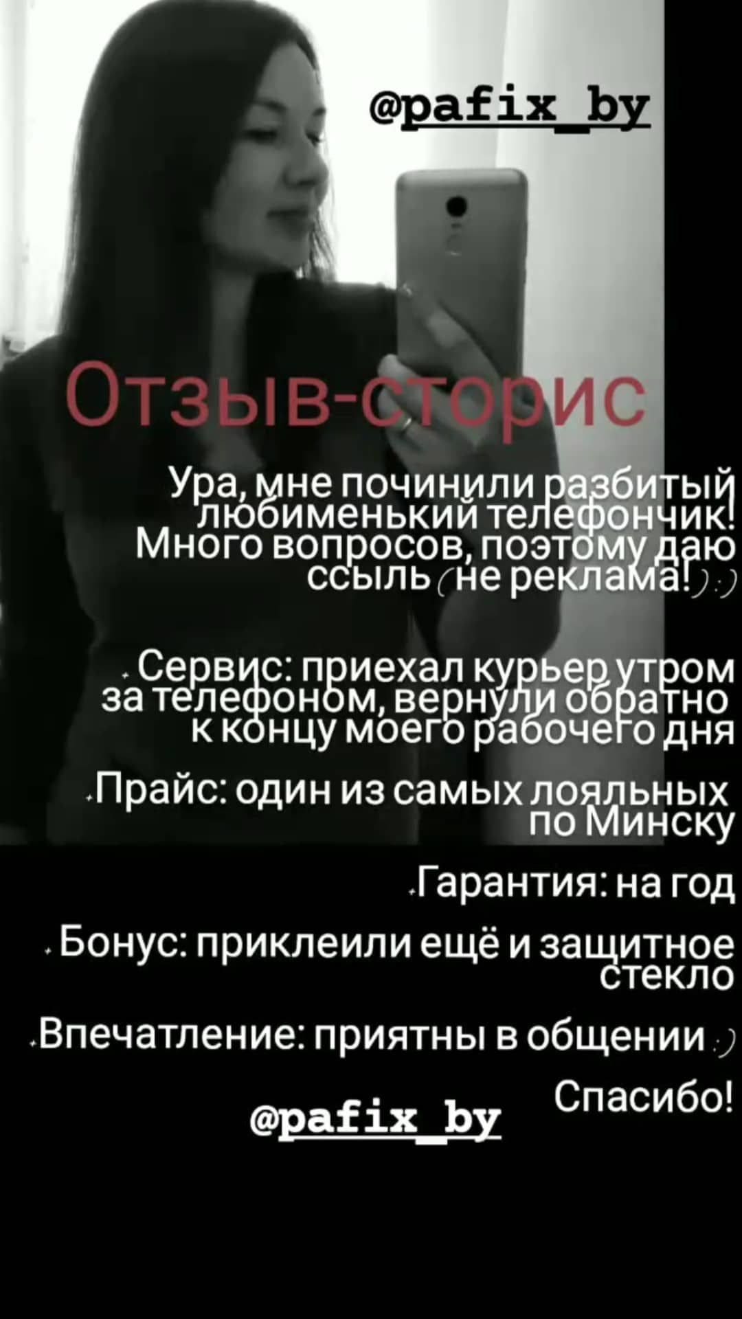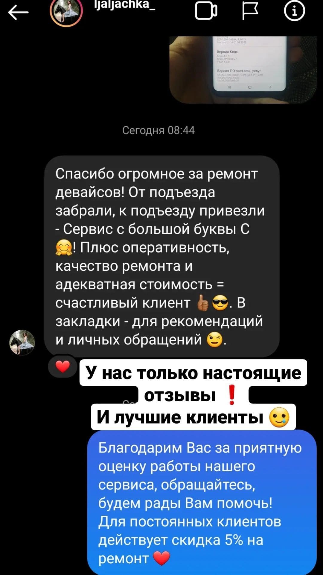 Markell II2024-10-06Trustindex проверяет, что первоначальным источником отзыва является Google. Перепаяли аудио порт на телефоне быстро и качественно. Другие ремонты не хотели и трогать ибо порт на верхней плате. Либо загибали гигантские цены на работу. Почему написал этот отзыв сейчас а не ~ 2 месяца назад? Хотел убедится в качестве проделанной работы. Галина Кук2024-10-02Trustindex проверяет, что первоначальным источником отзыва является Google. В августе меняли стекло на моем самсунг, осталась очень довольна ремонтом.Благодарю за качественный ремонт. виктор савченко2024-05-20Trustindex проверяет, что первоначальным источником отзыва является Google. Спасибо за ремонт! Очень доволен работой мастерской. Быстро, профессионально и качественно! Доброжелательное отношение к заказчику и отличная цена. Рекомендую обращаться, будете приятно удивлены!! Светлана2024-04-02Trustindex проверяет, что первоначальным источником отзыва является Google. Заходила в данный сервис центр, забыла написать отзыв. Подходили с супругом, очень довольны как общением с мастером Андреем, так и ремонтом в целом. Супруг долго общался с ним, на тему телефонов и планшетов, что лучше сейчас приобретать, целая дискуссия, вообщем благодарим мастера Андрея за ремонт, консультацию, всем довольны, все супер! Эльмира Балтаева2024-03-19Trustindex проверяет, что первоначальным источником отзыва является Google. Обращалась по срочному ремонту (было разбито стекло на телефоне, но ввиду того, что его отдельно от модуля сложно заменить, меняли сам модуль). Хочу поблагодарить мастера за аккуратную работу и проявленный профессионализм! Уже чинила однажды телефон в другом центре и очень разочаровалась, так как работу сделали по принципу "абы работало": везде были просветы, поцарапан экран, клей виднелся. По чистой случайности зашла в этот ремонтный центр и совсем не пожалела. Мастер сразу сказал, что работа сложная, поэтому ни на что особо не рассчитывала. Но была приятно удивлена скорости и аккуратности. Большое спасибо! инна любочко2024-02-10Trustindex проверяет, что первоначальным источником отзыва является Google. Обратились в данный сервис по поводу замены экрана на Poco M5 (днем разбили, вечером завезли). Первый раз они привезли телефон с пузырями, сказали подождать 2 недели и если ничего не поменяется, то переклеят. Прошло 2 недели и мы снова повезли телефон. Нам переклеили опять, уже неровно и светился чуть экран телефона (сказали, что неровно приложили стекло). И только в третий раз все получилось!!! Подумайте, стоит ли выбирать данный сервис? 8-ОСЬМУХА2023-05-17Trustindex проверяет, что первоначальным источником отзыва является Google. Просто лучший мастер,работа выполнена качеством,советую это место Наталья Мудрая2023-04-28Trustindex проверяет, что первоначальным источником отзыва является Google. Всем доброго времени суток! В мастерскую обратилась вечером ,после 21.00,экстренно. Мастер- молодой человек, профессионал своего дела провел диагностику,мне объяснил всё доступным языком. В этот же вечер заменил деталь(плата).Если придётся обращаться когда либо ещё, только данная мастерская.ВСЕМ СОВЕТУЮ,А ВАМ ВСЕХ БЛАГ И ПРОЦВЕТАНИЯ!!! Денис Пацанков2021-10-02Trustindex проверяет, что первоначальным источником отзыва является Google. Zloy Molochnik2021-09-28Trustindex проверяет, что первоначальным источником отзыва является Google. Телефон был разбит вдребезги, заменили дисплей и экран в короткие срок